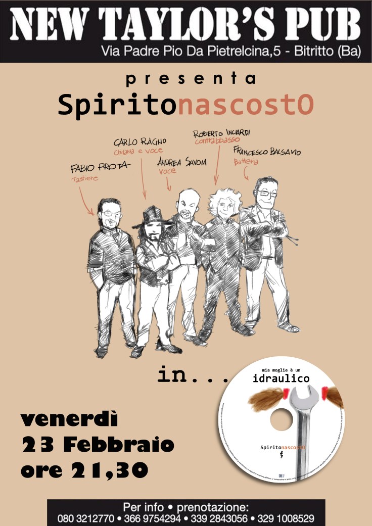 Domani sera avrò il piacere di esordire dal vivo insieme agli amici SpiritonascostO sul palco del New Taylor’s di Bitritto (BA).